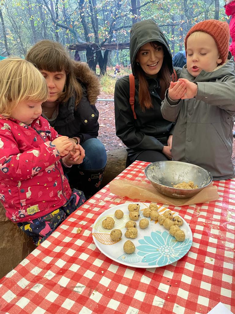 Image of 2 toddlers and their parents making the oat and raison cookies.